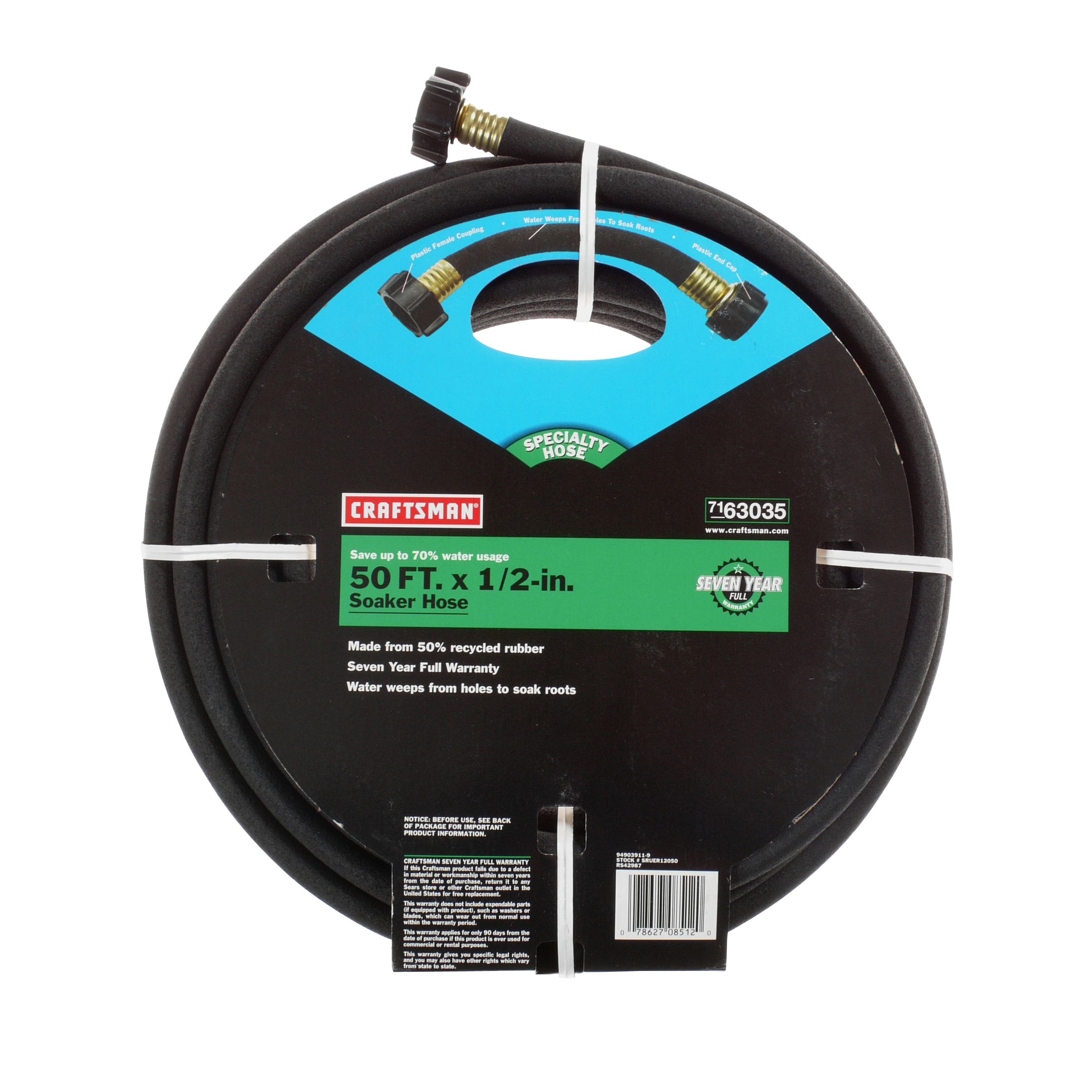 Today Only you can get this Craftsman 50-ft x 1/2-in Soaker Hose for $6.99. This specialty hose is made from 50% recycled rubber. Water weeps from holes to soak roots. Has a plastic female coupling and end cap. Seven year full warranty.