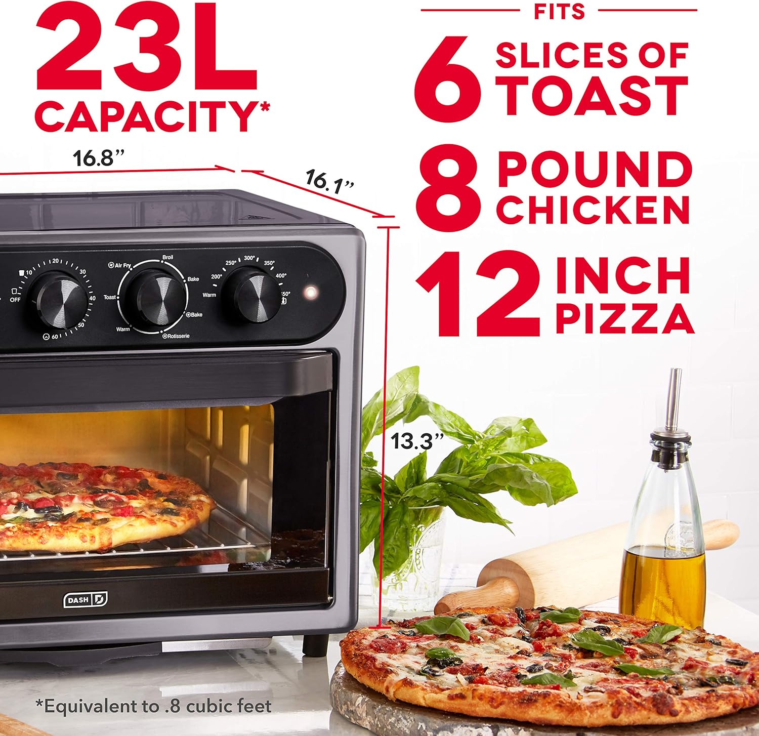 - LARGE CAPACITY: 23L (08 ft3) capacity is perfect for large families, entertaining, picky eaters and more. Holds up to 6 slices of toast, a whole rotisserie chicken, or a 12in pizza – the possibilities are endless