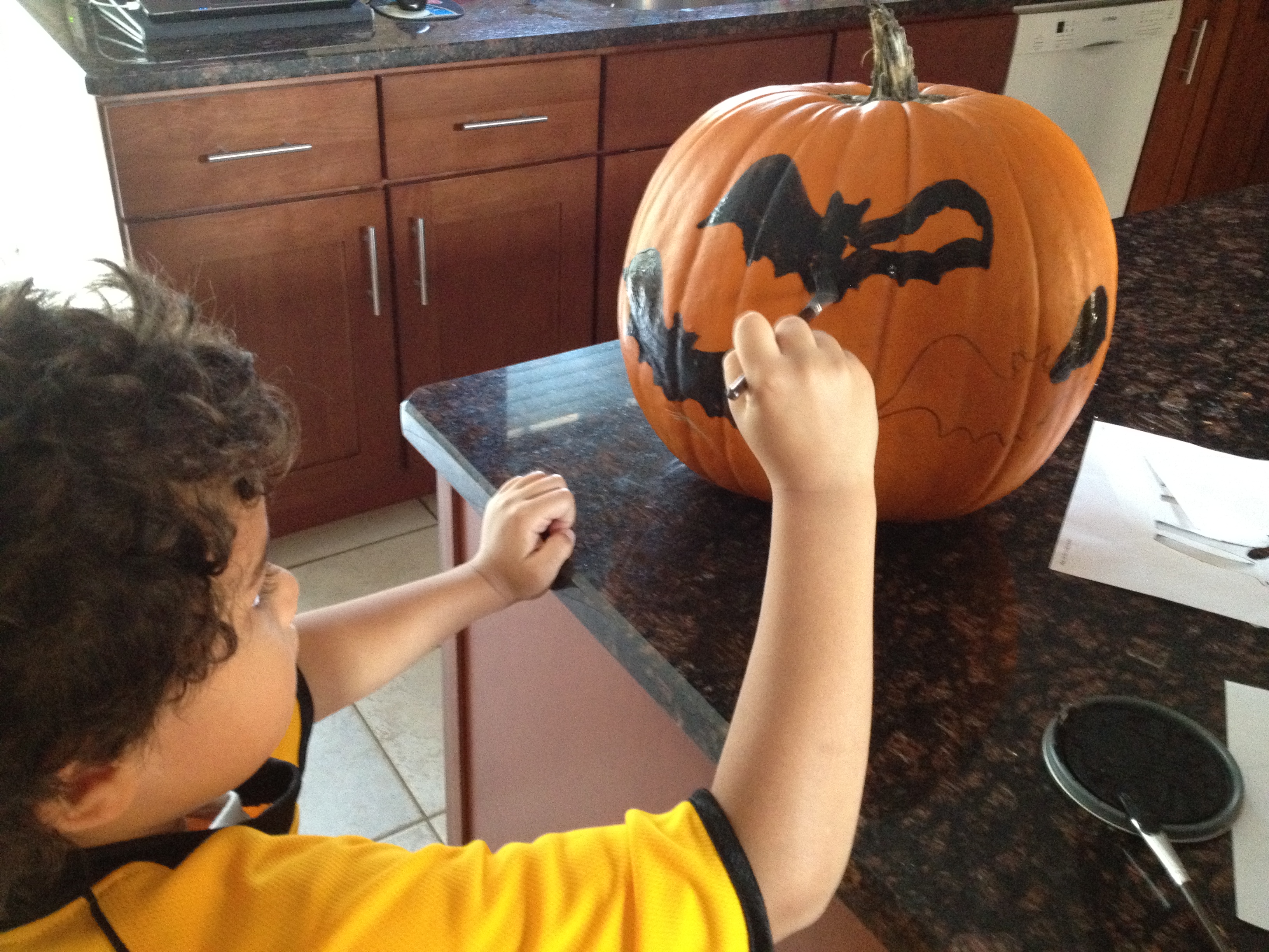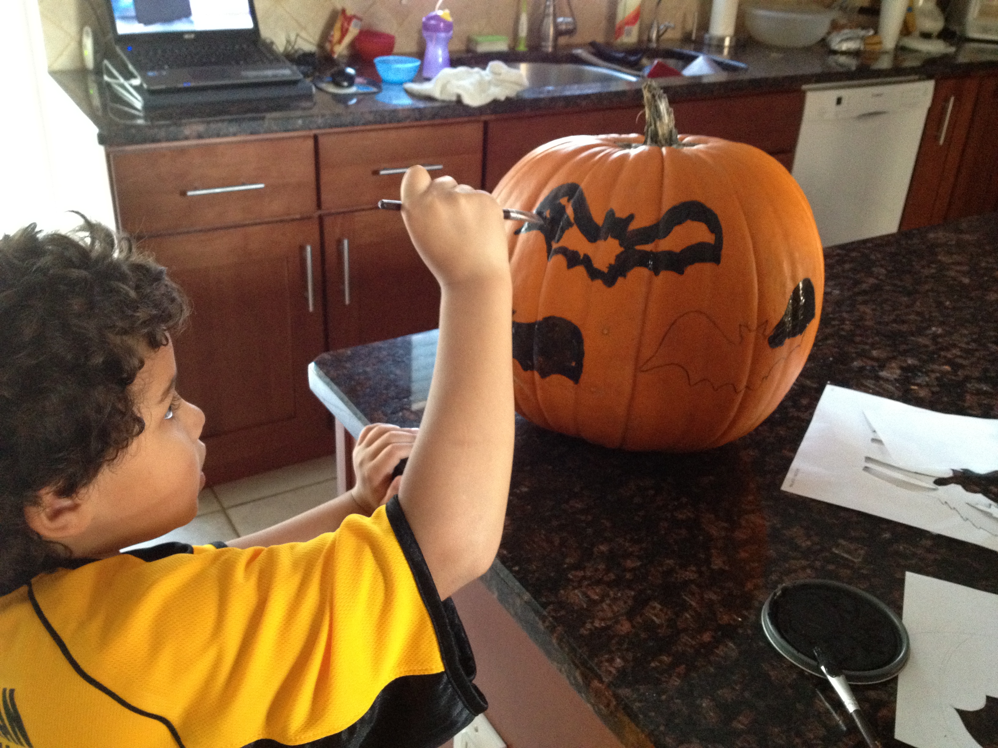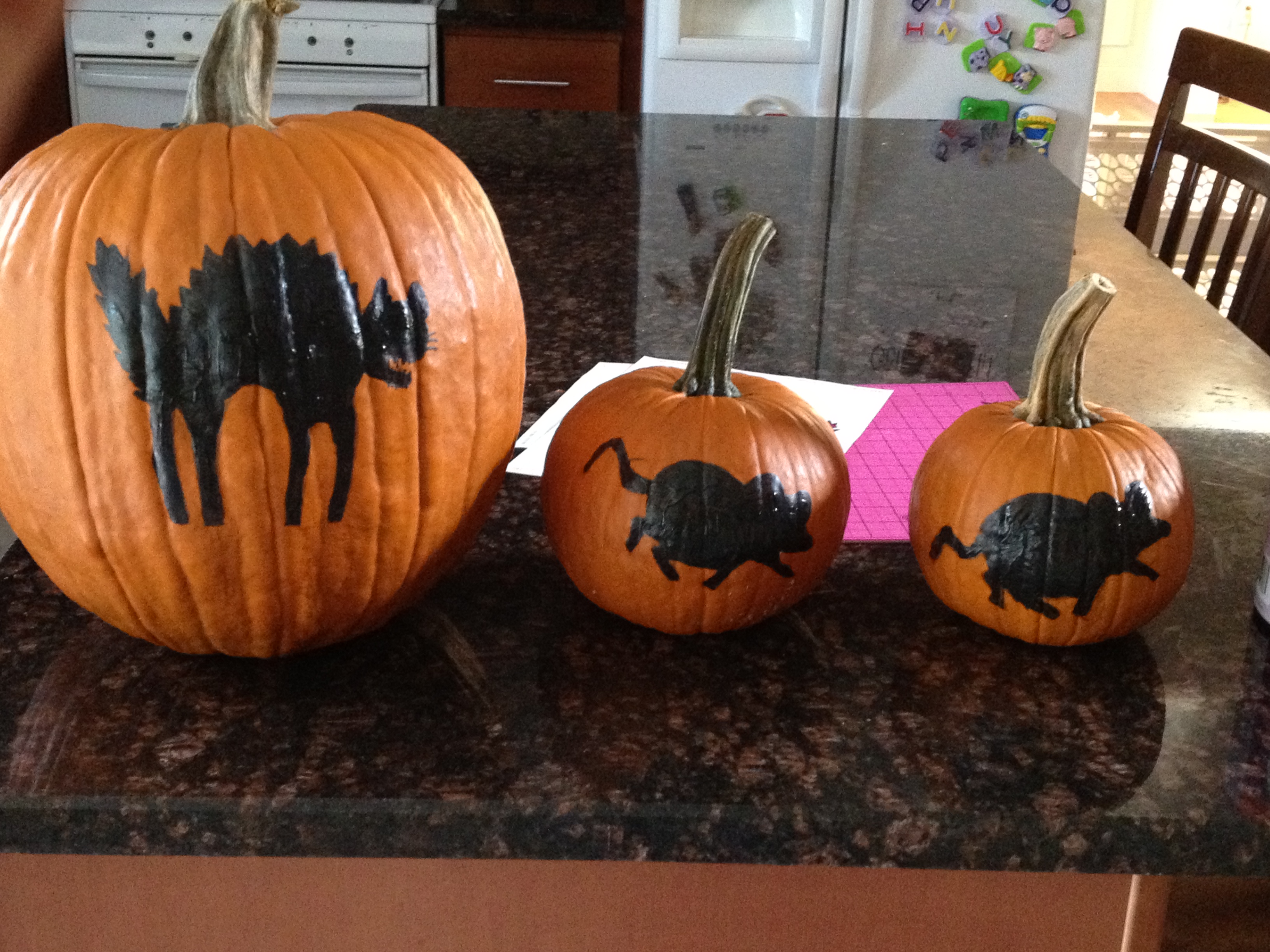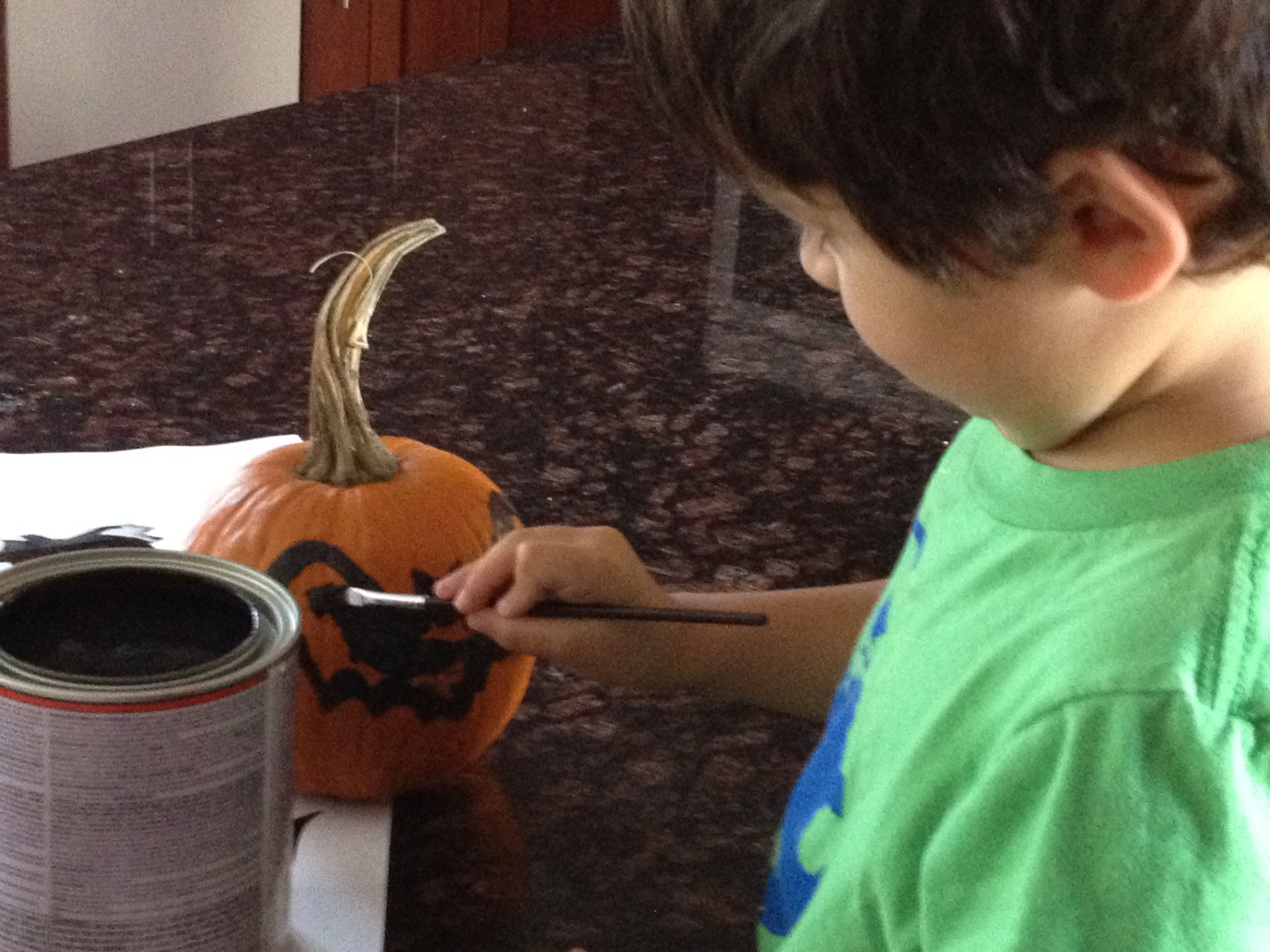 The instructions online said to use a grease pencil (?) to trace the image on the pumpkin. But I didn’t have that so I used a washable black marker instead since I was going to paint the images black. Then painted them with regular black paint. One tester would be enough to paint this and I did buy at Walmart small painting brushes to get the details.