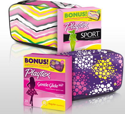 Get a free Stephanie Johnson cosmetic bag (a $45 value!) by mail when you buy any 2 specially-marked packages of Playtex Gentle Glide 360° Tampons (18 ct. or larger) or Playtex Sport Tampons (14 ct. or larger). You can choose from two different styles of cosmetic bags.